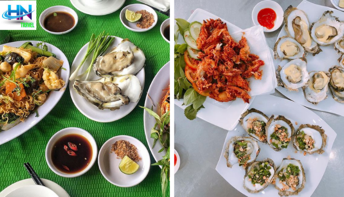 Sau đó, du khách có thể lên nhà thuyền ở Bến Đá để thưởng thức ẩm thực địa phương. Làng bè Long Sơn là vùng đất của các loại hải sản nổi tiếng, đặc biệt là hàu. Ở đây, hải sản luôn được chế biến khi còn tươi sống. Khám phá thiên nhiên của hòn đảo cũng là một trải nghiệm thú vị cho du khách. Đến với làng bè Long Sơn, bạn sẽ có những giờ thư giãn trong gió biển, ngắm nhìn các loại hình đàn cá tung tăng bơi lội rồi thưởng thức những món hải sản tươi sống bạn có thể thoải mái lựa chọn hải sản tại làng bè. Hải sản ở đây không chỉ tươi, chắc thịt mà còn có vị đậm đà, ngọt hơn những nơi khác, có lẽ nhờ thiên nhiên ưu đãi về nước và khí hậu. Ngoài ra một món ăn không thể bỏ qua khi đến với làng bè Long Sơn đó là gà nướng tại nơi này.