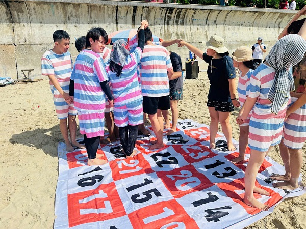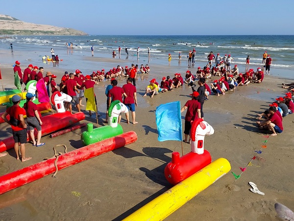 Sau khi đoàn ổn định vị trí và khu vực ghế dù, đoàn di chuyển ra bãi biển và tham gia chương trình TEAMBUILDING do MC Cty tổ chức với âm thanh chuyên nghiệp , sống động và vui nhộn, chương trình teambuilding tập thể là cơ hội tuyệt vời để đội nhóm cùng nhau xây dựng tinh thần đoàn kết, gắn kết và phát triển kỹ năng làm việc nhóm. Thông qua các hoạt động thú vị, thách thức và ý nghĩa, chương trình teambuilding giúp tạo ra môi trường tích cực, khích lệ sự hợp tác và sáng tạo trong công việc.