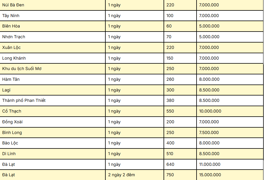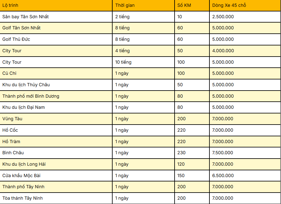 Giá thuê xe 45 chỗ có thể thay đổi dựa trên quãng đường di chuyển, thời gian thuê và loại xe được sử dụng. Dưới đây là bảng giá bảng giá thuê xe 45 chỗ giá rẻ tại TP.HCM để bạn tham khảo và lựa chọn phương án phù hợp nhất với nhu cầu di chuyển và khả năng tài chính của mình.