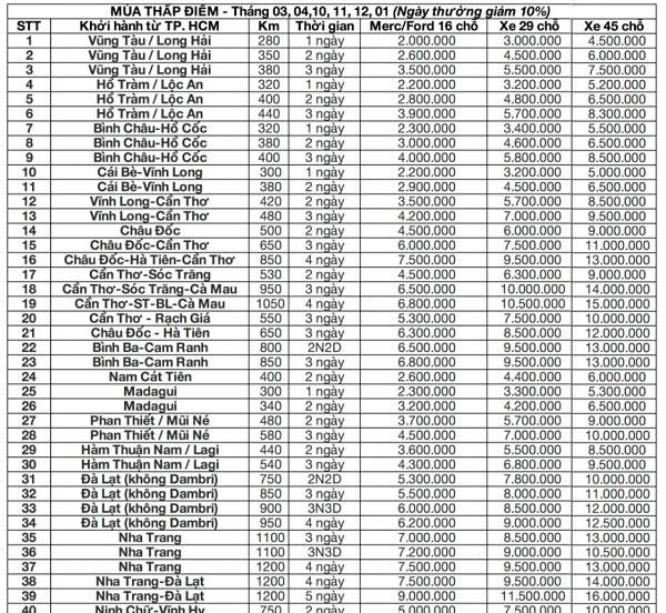 bảng giá thuê xe tham khảo