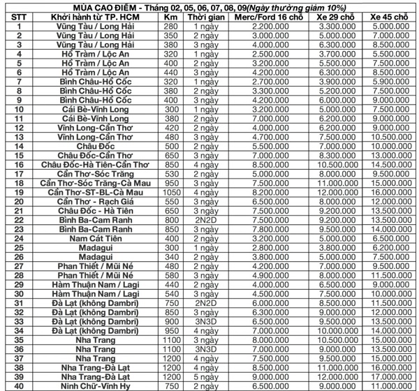 Bảng giá cho thuê xe 45 chỗ tại TPHCM