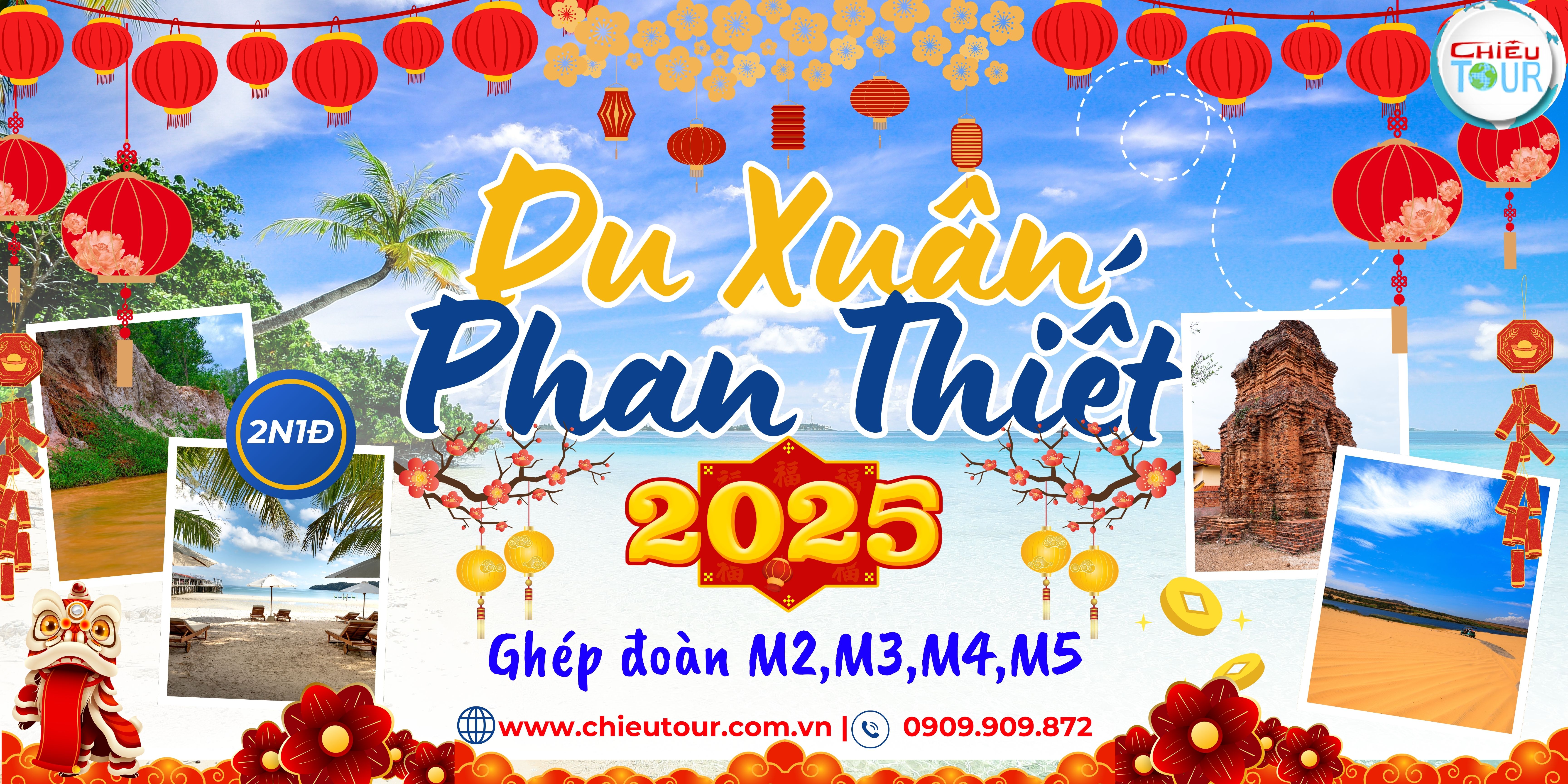 - Tour Phan Thiết - Tết Âm Lịch 2025 cùng Chiêu Tour là số lựa chọn hoàn hảo để bắt đầu một năm mới tràn đầy năng lượng và niềm vui. Hành trình đưa bạn đến với vẻ đẹp thơ mộng của Mũi Né, nơi biển xanh hòa quyện cát trắng và ánh nắng vàng rực rỡ. Thả mình vào khung cảnh lãng mạn tại Đồi Cát Bay, khám phá cổ kính tinh tế của Tháp Chàm Pô Sah Inư, và cảm nhận nhịp sống yên bình tại làng chài truyền thống. Không chỉ thưởng thức đặc sản hải sản tươi ngon, du khách còn được hòa mình vào không khí Tết sôi động, tận hưởng khoảnh khắc khắc thái thái bên gia đình. Đón xuân mới, khám phá sắc màu Phan Thiết – Tất cả đang chờ đón bạn cùng Chiêu Tour!