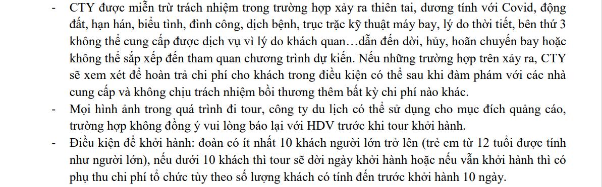 *Lưu ý : Tuỳ vào thời gian tình hình thực tế của đoàn và Tour leader Cty sẽ sắp xếp lại chương trình sao cho phù hợp và hợp lý nhất, nhưng vẫn đảm bảo đầy đủ các điểm tham quan được mô tả trong chương trình.